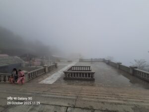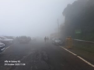 ऑफ कोर्स मी जिओचा बोलतोय सो छान सगळ्या ठिकाणी कनेक्टिव्हिटी मिळत गेली आणि शेवटी एक तीन चार किलोमीटर ला मोठा घाट चढ आहे एकदम ब्रह्मगिरी डोंगरावर जायला , आहे कावेरी नदीच्या उगमापाशी जायला आणि तिथे जाताना प्रचंड धुकं म्हणजे दहा मीटर सुद्धा दिसत नाही इतकं प्रचंड दाट धुके असं त्या भागात आहे