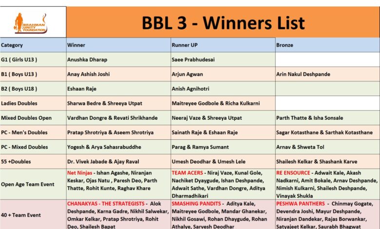 Brahman Unity Foundation Successfully Concludes ‘BBL 3’ Badminton Tournament in Pune / ब्राह्मण युनिटी फाउंडेशनतर्फे आयोजित ‘बीबीएल ३’ (BBL 3) बॅडमिंटन स्पर्धेचा पुण्यात शानदार समारोप